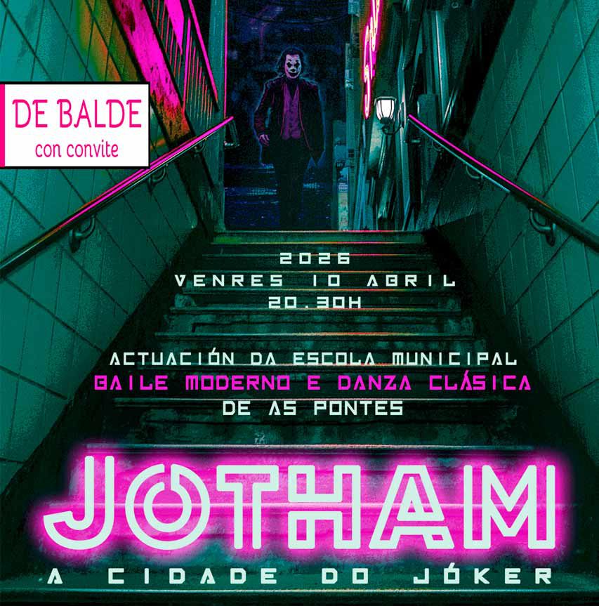 La Escuela Municipal de Danza del Ayuntamiento de As Pontes ofrece su último espectáculo, JOTHAM. A cidade do Jóker, que recrea el ambiente de suspense y evoca la estética de la ciudad gótica. En el grupo de baile contamos con más de 100 personas de edades comprendidas entre los 10 y los 60 años, en las disciplinas de baile moderno y danza clásica, que rinden homenaje al cómic y a las versiones cinematográficas del Jóker. Este espectáculo fue representando en As Pontes en junio y diciembre de 2025 con una gran respuesta del público.